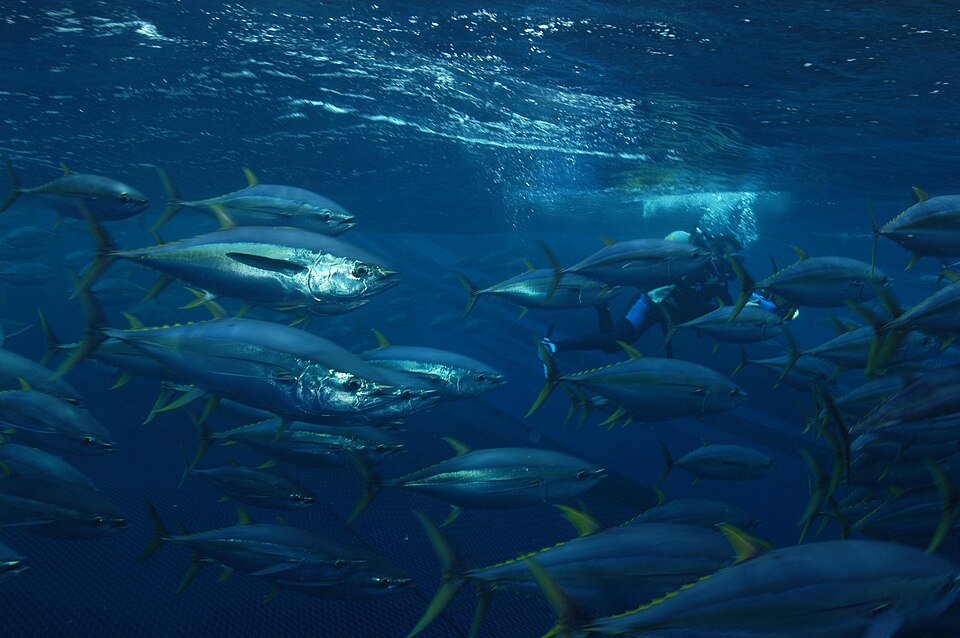 Ein Schwarm von Gelbflossen-Thunfischen Thunnus albacares (Foto Marc Taquet / Wikimedia Commons)