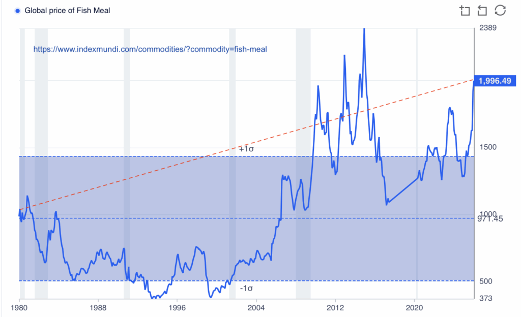 Dank industrieller Fischerei konnten grosse Mengen von kleinen Arten für die Fischmehlherstellung gewonnen werden, dementsprechend tief waren die Preise bis Ende der 1990er Jahre. Danach stiegen sie und bleiben sieiher trotz Schwanklungen auf hohem Niveau.